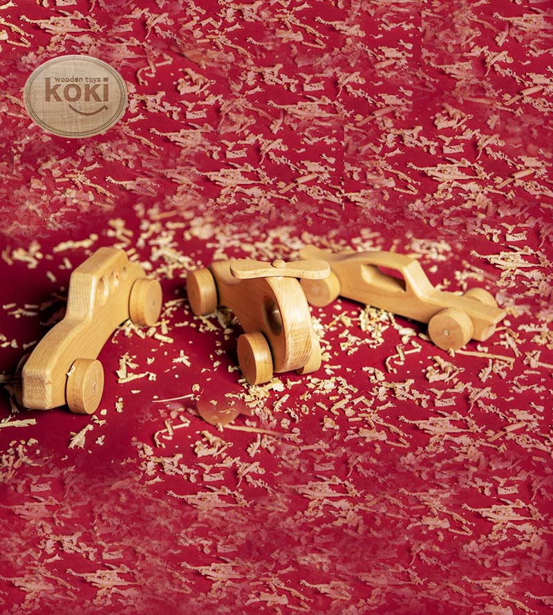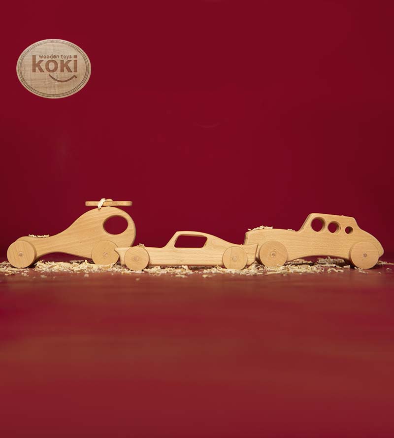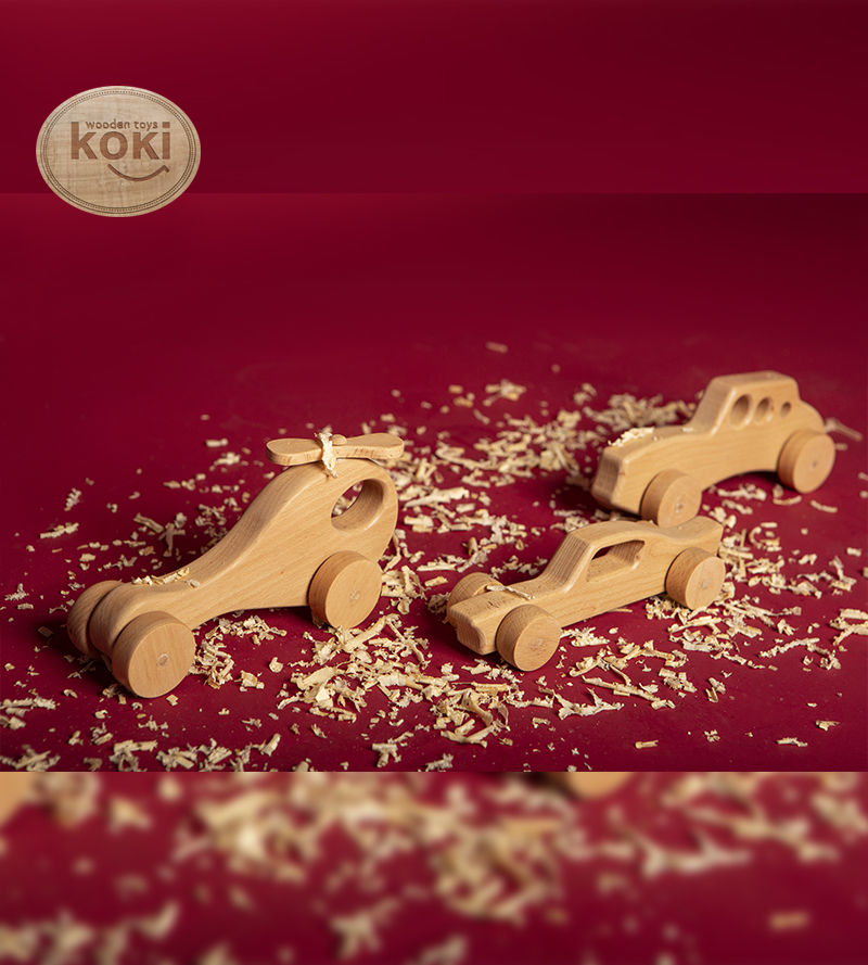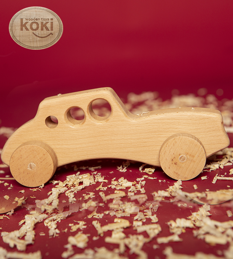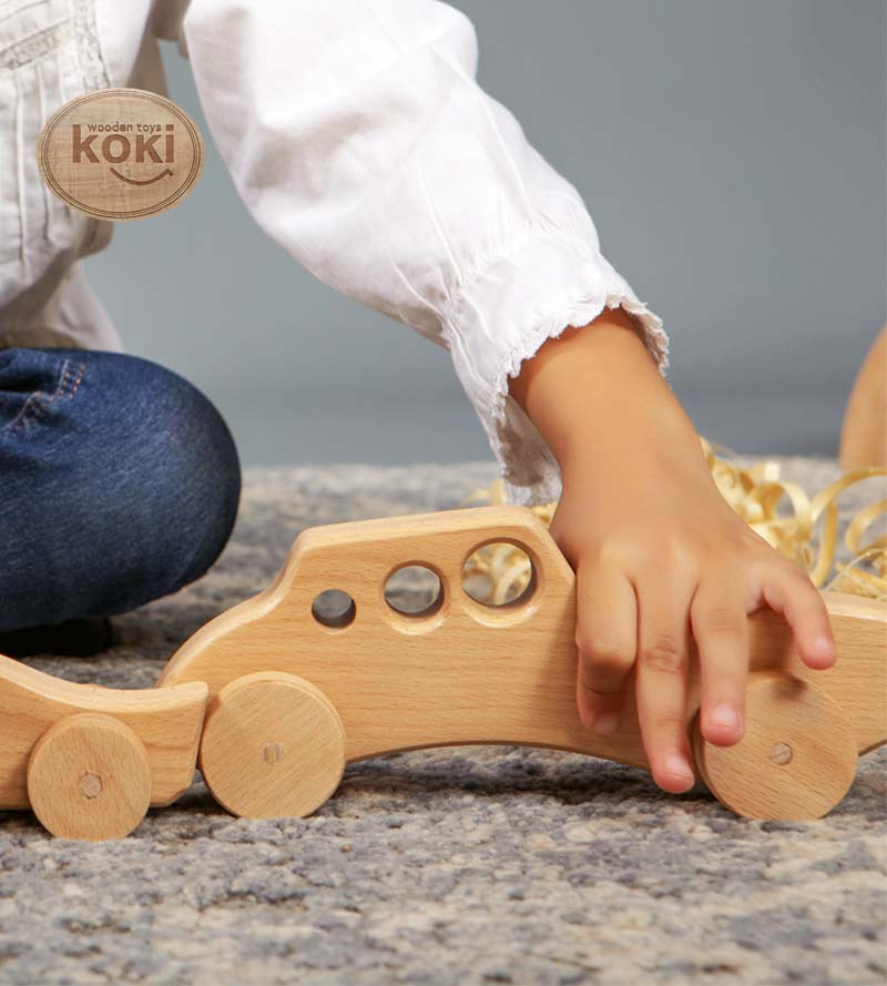 Voici une belle Voiture en Bois. Fabriquée avec du bois solide sélectionné par la marque koki, cette petite voiture accompagnera votre enfant partout.